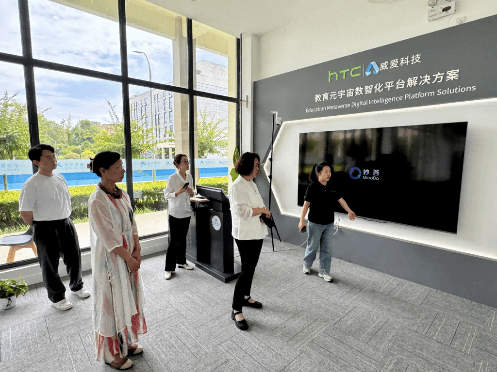 学院代表团首先到访成都威爱数矩(威爱科技数智化教育事业部)办事处。营销经理吴敏详细介绍公司发展概况、元宇宙及VR/MR业务布局,以及AI-LBE(Location Based Education)驱动下的“AI大模型元宇宙沉浸式交互技术联合研发中心”的建设与荣誉。