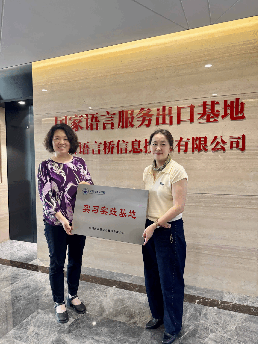 学院代表团第三站来到国家语言服务出口基地——四川语言桥信息技术有限公司,了解其作为国内外语服务龙头企业的业务分布与服务模式。代表团体验了其最新“AI系统”与“专家系统”协同服务模式,段荣娟院长、张海燕副院长介绍了学院MTI翻译硕士专业的教学与科研成果,双方就产教深度融合、聘请行业导师、共建实习实践基地等方面达成共识,并举行实习基地授牌,确立后续合作方向。