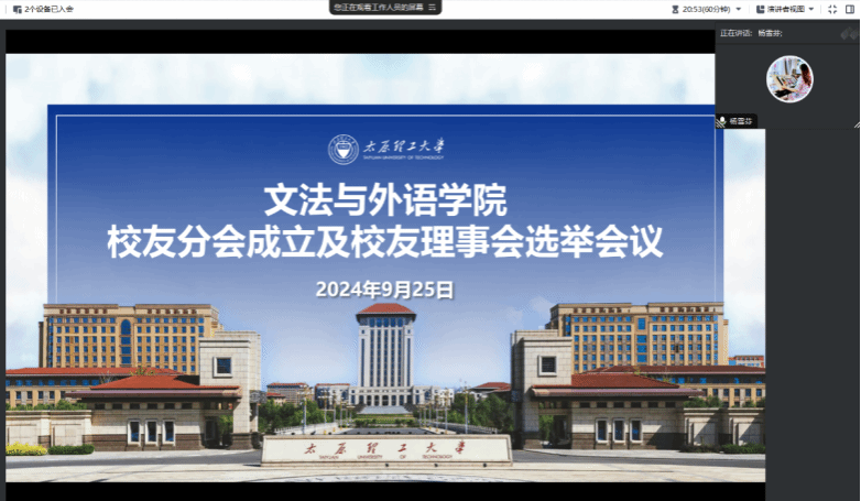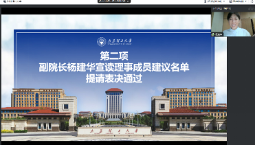 9月25日晚,pg娱乐电子游戏官网入口校友分会成立及理事会选举会议圆满举行。本次会议通过腾讯会议的方式线上开展,来自全国各地的校友们相聚云端,共襄盛举。pg娱乐电子游戏官网入口党委书记申晓东、院长段荣娟、副院长杨建华、张海燕以及教师与学生代表参加会议,会议由院党委副书记杨雪芬主持。