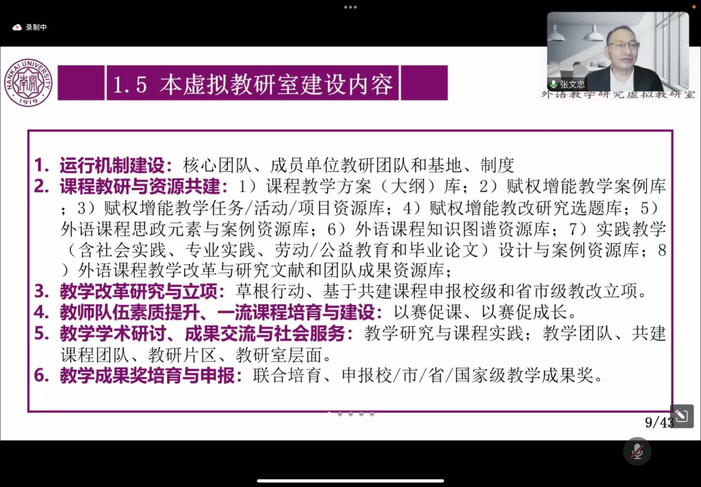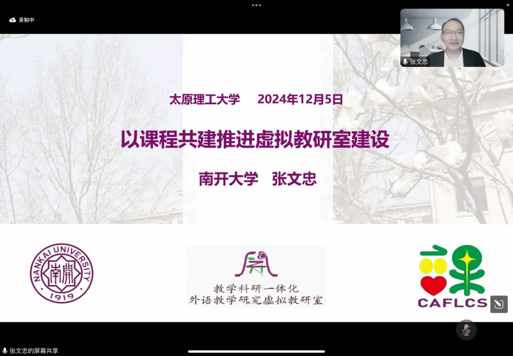 12月5日晚19:30分,南开大学张文忠教授为pg娱乐电子游戏官网入口承担的山西省百亿工程项目“外语虚拟教研室建设”作了题为“以课程共建推进虚拟教研室建设”的线上学术讲座。本次讲座面向外语虚拟教研室建设团队成员及教研室所有师生,由pg娱乐电子游戏官网入口院长段荣娟教授主持。