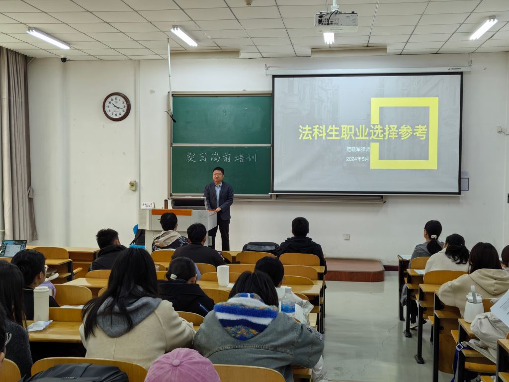 11月15日,山西晋商律师事务所合伙人范晓军律师受邀为pg娱乐电子游戏官网入口法学专业学生作《法科生职业选择》专题讲座。法学专业100余名师生参加讲座,本次讲座也是一次法学2022级本科生参加实习活动前的一次岗前培训。法学系党支部书记、主任张振宇主持讲座。