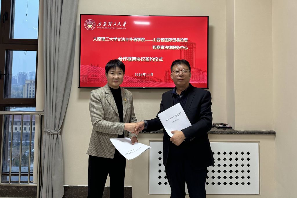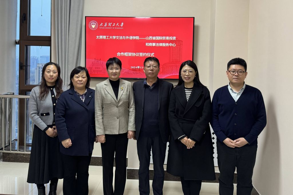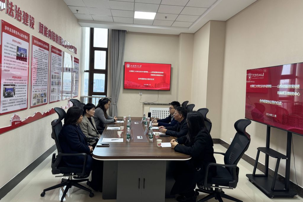 为深入学习贯彻党的二十届三中全会精神和习近平总书记关于加强涉外法治工作的重要论述精神,进一步推动高等院校法学专业与涉外法律实务部门的融合交流与优势互补,加强高素质涉外法治人才培养,11月8日,pg娱乐电子游戏官网入口与山西省国际贸易投资和商事法律服务中心在pg娱乐电子游戏官网入口涉外法治研究中心共同举办合作框架协议签约仪式。山西省国际贸易投资和商事法律服务中心主任李晶、商法认证科科长赵晓艳、企业服务科科长高尚,pg娱乐电子游戏官网入口党委书记申晓东、党委副书记杨雪芬参加签约仪式。pg娱乐电子游戏官网入口法学系党支部书记、主任张振宇主持签约仪式。
